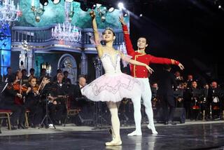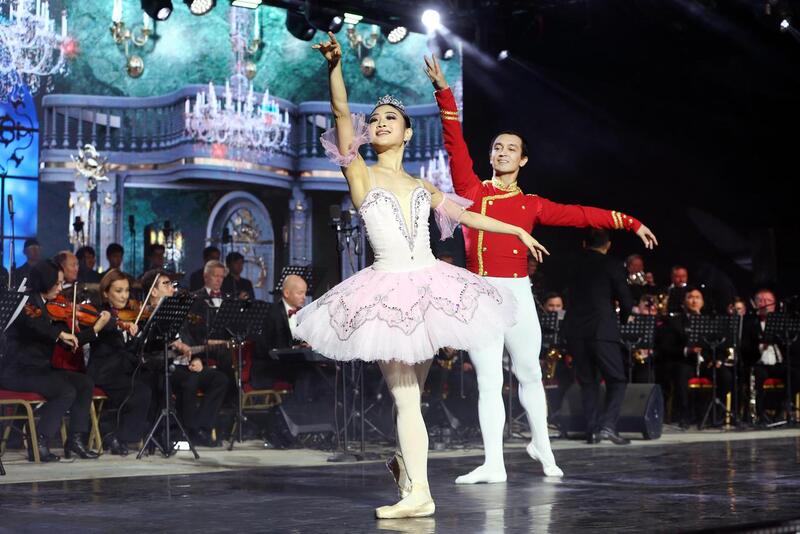 Украшением вечера стала японская балерина Ариса Хасимото, которая вместе с ведущим солистом КазНТОБ имени Абая Рустемом Имангалиевым подарила публике изысканное адажио Чайковского из балета «Щелкунчик».