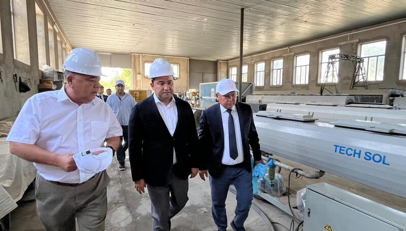 Визит продолжился в цехе по производству полиэтиленовых труб ТОО «Стас и К» в селе Т. Рыскулова. Н. Кушеров полностью осмотрел здание завода, ознакомился с видами продукции.