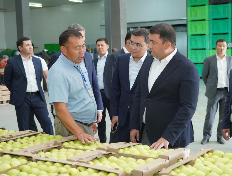 Аким области сначала побывал на предприятии по переработке яблок ТОО «Кен-Тау», расположенном в населенном пункте Шакпак, и ознакомился с водосберегающими технологиями и строительством вспомогательного склада.