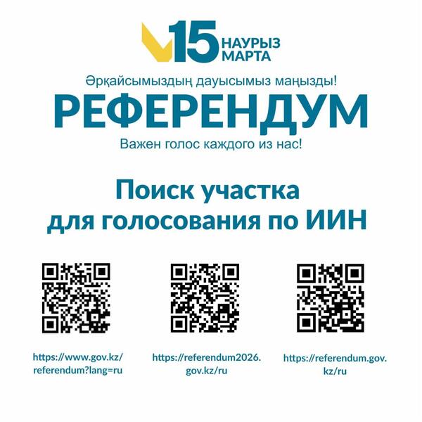 Отсканировав указанный выше QR-код, граждане могут перейти в специальный раздел сайта и, введя ИИН, определить свой участок для голосования на референдуме; Узнать свой участок для голосования, введя ИИН, также можно по следующим ссылкам:https://www.gov.kz/referendum?lang=kk