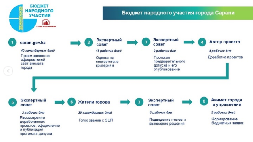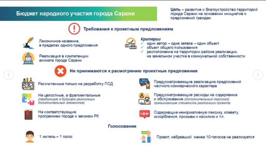 ГУ «Аппарат акима города Сарани» с 20 января по 1 марта текущего года приступает к принятию заявок (предложений) от жителей города по проекту «Бюджет народного участия» (благоустройство объектов) (далее – БНУ) на 2027 год, в рамках которого граждане могут принять участие в планировании и благоустройстве города.Горожане имеют возможность предложить проектные предложения по следующим направлениям (автор может подать только одно проектное предложение):▪ Установка и ремонт спортивных, детских игровых площадок▪ на дворовых территориях и в местах общего пользования▪ Создание и ремонт общественных пространств (парки, скверы, пешеходные зоны и др.)▪ Внутридворовое освещение▪ Установка остановочных комплексов▪ Установка уличного, паркового освещения▪ Строительство и ремонт тротуаров, пандусов, ливневой канализации▪ Установка урн для мусора, вазонов, приствольных решеток, скамеек▪ Установка, замена и ремонт контейнерных площадок для сбора ТБО▪ Установка малых архитектурных форм▪ Ремонт бордюр, брусчатки, подпорных стен▪ Другие проектыТребования к проектным предложениям:1) название проектного предложения должно быть изложено лаконично, в пределах одного предложения, и не должно противоречить цели подаваемого проектного предложения;2) проектные предложения должны отвечать следующим критериям:- одна заявка - один объект;- объект общего пользования;- расположение на территории города реализации, на земельном участке в коммунальной собственности3) реализация проектного предложения должна находиться в пределах компетенции акимата;Проектные предложения подаются в электронном виде на официальном Интернет-ресурсе акимата города Сарани в разделе «Бюджет народного участия 2026»