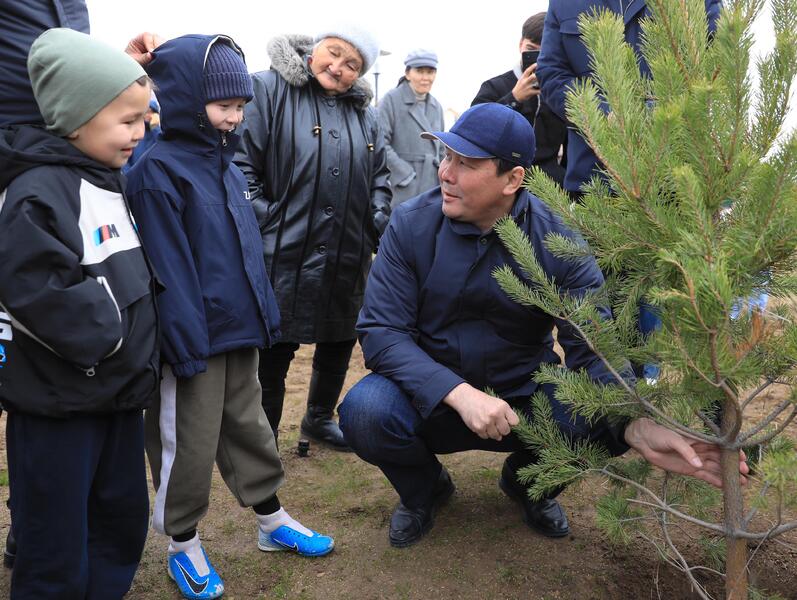 Сегодня аким области Асхат Шахаров посадил на территории сквера деревья. Тридцать сосен украсили зону отдыха.