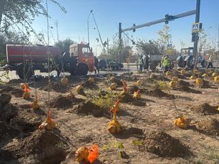 В рамках акции «Таза Қазақстан» продолжается масштабная посадка деревьев в городе Конаев. Всего планируется высадить 300 деревьев, в том числе 150 тополей, 25 акаций жёлтых, 40 катальп и 60 вязов.