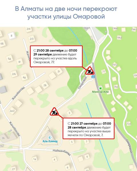 В связи с этим, с 21:00 27 сентября до 07:00 28 сентября движение будет перекрыто на участке выше мечети по Омаровой, 7.