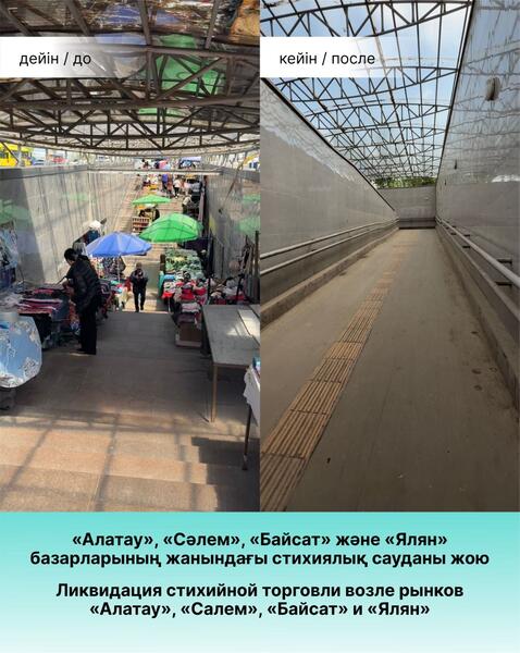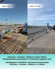 В результате проведенных рейдов ликвидировано более 100 точек стихийной торговли, составлено 42 административных протокола по ст.204 КоАП РК «Торговля в неустановленных местах», ст. 505 КоАП РК «Правила благоустройства», а также вывезено более 70 кубометров мусора.