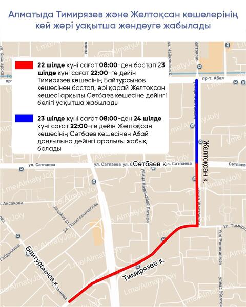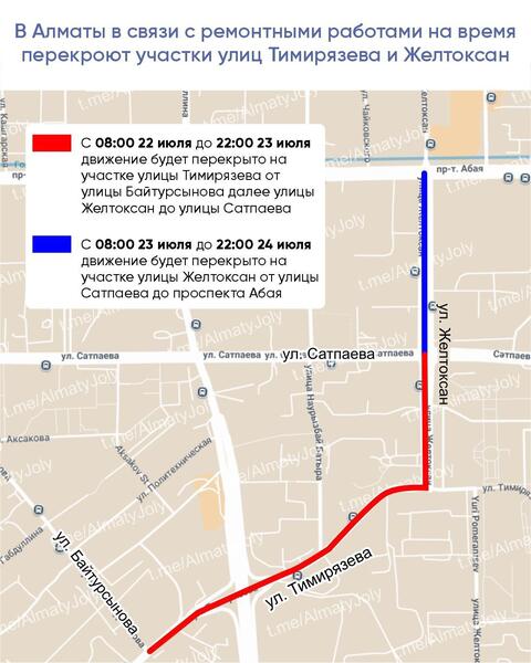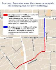 Так, с 08:00 22 июля до 22:00 23 июля движение будет перекрыто на участке улицы Тимирязева от улицы Байтурсынова далее улицы Желтоксан до улицы Сатпаева.