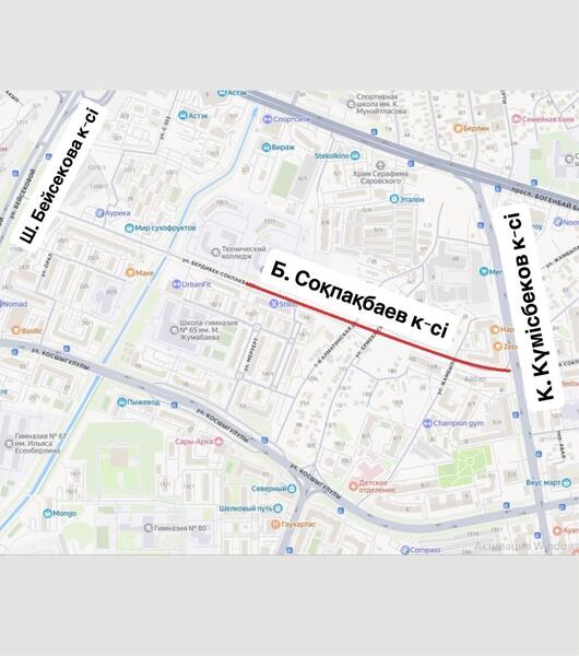 - будет продолжено строительство улицы Б. Сокпакбаева на участке от ул. Ш. Бейсековой до ул. К. Кумисбекова. Движение на данном участке будет полностью перекрыто в период с 5 апреля по ноябрь текущего года.