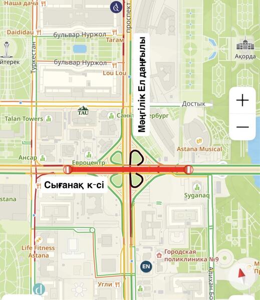 Так, с 4 апреля по 4 мая планируется проведение среднего ремонта дорожного полотна на транспортной развязке на пересечении пр. Мангилик Ел и ул. Сыганак. Движение будет перекрыто частично.