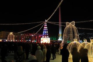 В Караганде дан старт новогодним праздникам — на площади Независимости высокая зелёная красавица засверкала разноцветными огнями. Её украсили десятки игрушек и гирлянд, а рядом установили светящиеся декоративные конструкции.