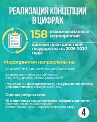 Эта концепция является единым стратегическим документом государственной политики в сфере детства на 2026-2030 годы. Концепция объединяет меры по защите прав и благополучию 6,9 млн детей в единую систему с чёткими шагами, измеримыми результатами и межведомственной ответственностью, формируя новую архитектуру защиты детства по всей стране.