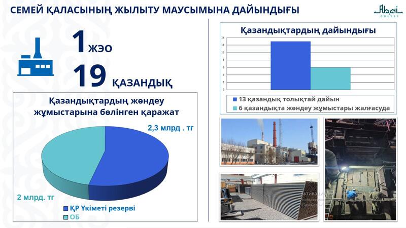 Город Семей обеспечивается теплом от ТЭЦ-1 и 19 котельных. На сегодняшний день 13 из них полностью готовы к зиме. На оставшихся 6 котельных (резервные котлы и оборудование) ремонтные работы завершатся до 25 сентября.
