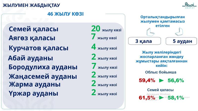 Централизованным теплоснабжением в области Абай обеспечены 3 города и 5 районов: Семей, Курчатов, Аягоз, а также сёла Шуак и поселок Әуезов (Жарминский район), село Бородулиха и поселок Жезкент (Бородулихинский район), поселок Шульбинск (район Жаңасемей), село Карауыл (Абайский район) и село Урджар (Урджарский район).