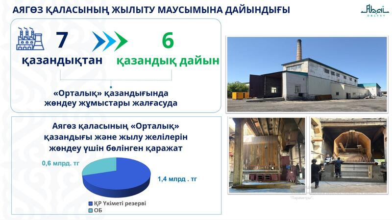 «В Аягозе тепло подают 7 котельных. В настоящее время 6 котельных полностью готовы к отопительному сезону. На «Центральной» котельной ремонт котлов ведется в две смены. В результате замены отопительных котлов мощностью 4,4 гигакалории на новые котлы мощностью 10 гигакалорий, общая мощность котельной увеличится с 9,5 до 30 гигакалорий. Это позволит дополнительно обеспечить централизованным отоплением около 400 абонентов. Первый котел планируем ввести в эксплуатацию до 20 сентября, а второй резервный – до 15 октября», – отметил глава региона.
