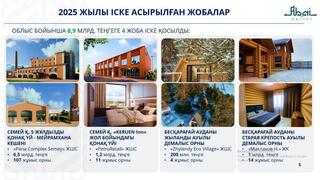 До 2029 года в области планируется реализация 48 проектов на сумму 87,4 млрд тенге. Одним из крупных проектов является строительство лечебно-оздоровительного комплекса «Алаколь» с участием инвесторов из Азербайджанской Республики — в настоящее время согласовывается место строительства. Также запланировано строительство санатория с грязелечением на озере Шипалы. Эскизный проект уже разработан, начало строительных работ запланировано на апрель. В городе Семей продолжается строительство торгово-развлекательного центра «Semey Mall». Кроме того, ТОО «Abay Hospitality Group» и ТОО «PanaComplexSemey» планируют строительство этнокомплекса, визит-центра и кафе «Тары» в районе Жидебай Абайского района. Работа в данном направлении будет продолжена.