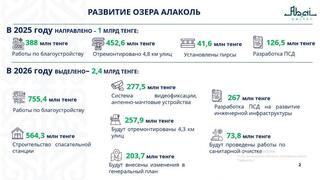В области планируется реализация масштабных проектов, направленных на развитие туристической инфраструктуры. В прошлом году на развитие побережья Алаколя было направлено 1 млрд тенге. В селе Кабанбай завершено строительство спасательной станции. На берегу озера проведены работы по благоустройству и ремонту улиц. В текущем году на развитие зоны отдыха Алаколь из местного бюджета выделено 2,4 млрд тенге. Планируется продолжение работ по благоустройству и ремонту улиц. До начала купального сезона с применением технологий искусственного интеллекта будут установлены 117 современных камер видеонаблюдения, 6 антенно-мачтовых сооружений, а также обеспечено полное покрытие мобильной интернет-связью.