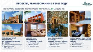 В 2025 году в туристической отрасли области реализованы 4 проекта на сумму 8,9 млрд тенге. В их числе — строительство пятизвездочного гостинично-ресторанного комплекса «Pana Unique Semey» стоимостью 6,5 млрд тенге в городе Семей в рамках инвестиционного форума «Туған жерге туыңды тік». Объект был введен в эксплуатацию в преддверии Нового года, создано 107 новых рабочих мест. В Бескарагайском районе на территории Старой Крепости введена в эксплуатацию комплексная зона отдыха с рыбным хозяйством стоимостью 1 млрд тенге. В целях развития придорожного сервиса в прошлом году на трассе «Семей – Павлодар» ТОО «Petro Retail» открыло гостиницу Keruen Inn.