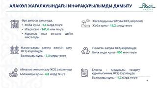Еще одной актуальной проблемой остается дефицит электроэнергии и изношенность электрических сетей. Для ее решения разработана проектно-сметная документация на строительство магистральной линии электропередачи и трансформаторной подстанции, которая проходит государственную экспертизу. На текущий купальный сезон предусмотрено 275 млн тенге на ремонт и обслуживание электрических сетей и внутренних подстанций. Также разрабатывается проектно-сметная документация на строительство полигона твердых бытовых отходов в туристической зоне. Выделены средства на разработку ПСД для строительства водопроводных и канализационных сетей, а также блочно-модульных очистных сооружений.
