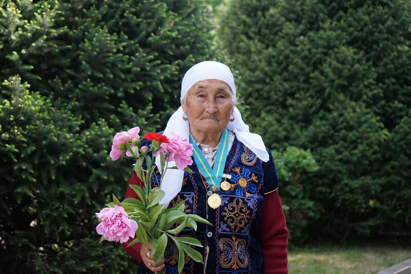 Среди горожан, посетивших церемонию возложения к Обелиску Славы в Талдыкоргане, мать-героиня, обладательница «Алтын алқа» Ултай Дуйсенбекова: