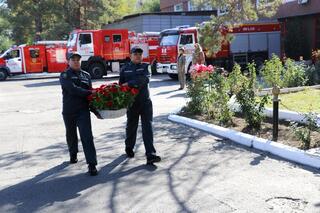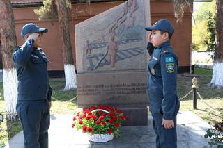 Торжественное мероприятие началось с возложения цветов к памятнику «Вечная память погибшим при ликвидации пожара на станции Алма-Ата-1» на территории пожарной части №11. Память героев почтили минутой молчания.
