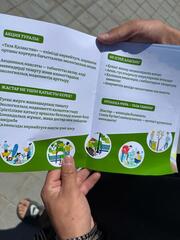 В городе Сатпаев с целью повышения экологической грамотности населения молодежь и волонтеры раздавали брошюры и буклеты жителям. Они дали жителям советы по переработке отходов, экономии энергии и воды, сохранению природных ресурсов и предотвращению мусора в общественных местах.
