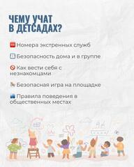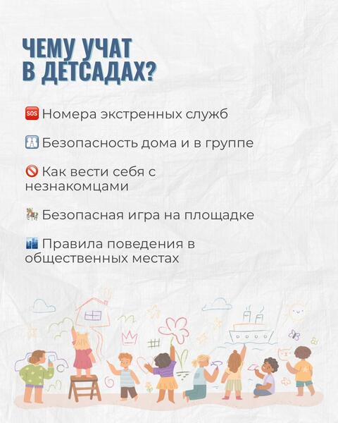 В детских садах дети знакомятся с номерами экстренных служб, правилами безопасного поведения дома, в группе и на прогулке. Особое внимание уделено тому, как вести себя при встрече с незнакомыми взрослыми, как безопасно играть на площадке и как вести себя в общественных местах.