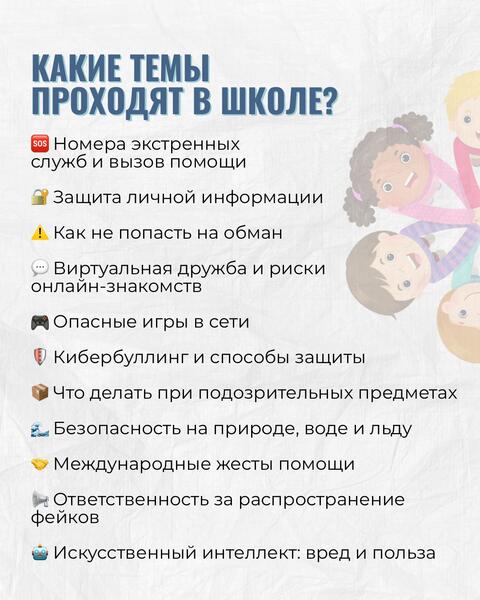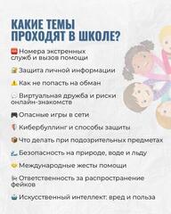 В школах внимание сосредоточено на безопасности в реальной и цифровой среде. Дети учатся защищать личные данные, распознавать кибербуллинг, избегать рисков онлайн-общения, понимать ответственность за распространение фейков, правильно действовать при обнаружении подозрительных предметов и соблюдать правила безопасности на природе, воде и льду.