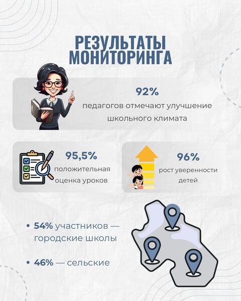 Результаты мониторинга демонстрируют высокую востребованность и значимость уроков. 92% педагогов отметили улучшение школьного климата, 96% сообщили о росте уверенности у школьников, 95,5% учащихся положительно оценили уроки, а 90% считают полученные знания и навыки практически полезными.