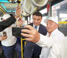 Аким Туркестанской области Нуралхан Кушеров стал одним из первых пассажиров нового электроавтобуса, запущенного в областном центре. Глава региона принял участие в торжественной церемонии передачи ключей от 35 современных автобусов перевозчикам города.
