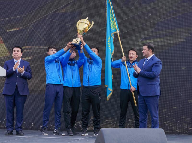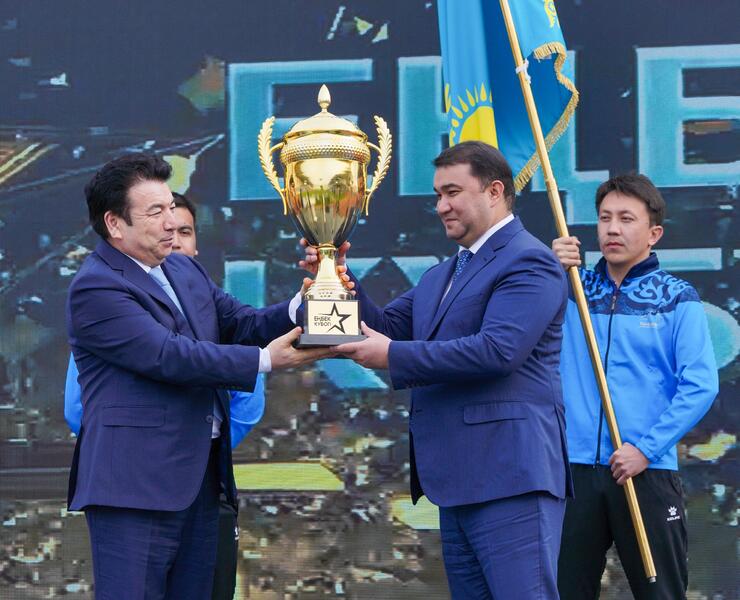 - От всей души поздравляю с открытием первой республиканской спартакиады «Кубок труда», организованной среди студентов колледжей в рамках объявленного Главой государства Года рабочих профессий! Большое значение имеет то, что республиканская спартакиада проводится в священном и историческом месте нашей страны – городе Туркестане. Этот регион - яркий пример единства, цивилизации, культуры и созидания. В настоящее время ведется большая работа по трансформации системы технического и профессионального образования. С 1 сентября 2025 года объем подушевого финансирования увеличится вдвое. Это позволит улучшить материально-техническую базу колледжей, повысить квалификацию педагогов. Надеюсь, что сегодняшняя спартакиада не только подарит вам спортивную энергию, но и сформирует новое отношение к труду. Желаю всем удачи, крепкого здоровья и высоких побед! - сказал Гани Бейсембаев и вручил Кубок труда акиму Туркестанской области Нуралхану Кушерову.