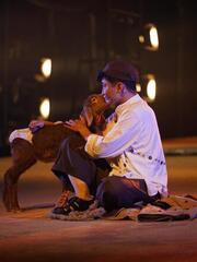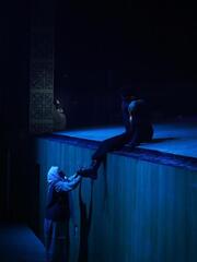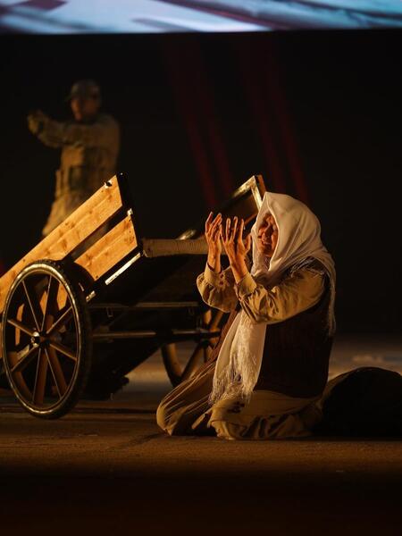 Спектакль поставлен по мотивам фильма кыргызского режиссера Руслана Акуна «Рай под ногами матерей». Постановка художественным языком раскрывает тонкие струны человеческой души, истинную суть милосердия и веры. Через сценические решения были проникновенно переданы тепло материнских рук, чистота детской веры и высокое благородство безмолвного самопожертвования, ставшие стержнем произведения. Режиссер постановки - Али Бидахмет, автор инсценировки - Казыбек Аманжол.