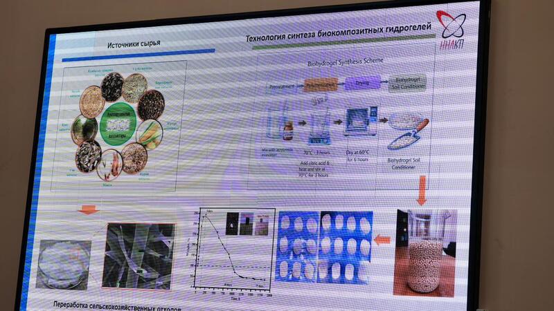Заведующий Национальной научной лабораторией Восточно-Казахстанского университета имени С. Аманжолова Акатан Кыдырмолла представил доклад «Разработка биокомпозиционного материала для улучшения влагосодержания и агрохимических показателей почвы и защиты сельскохозяйственных культур».