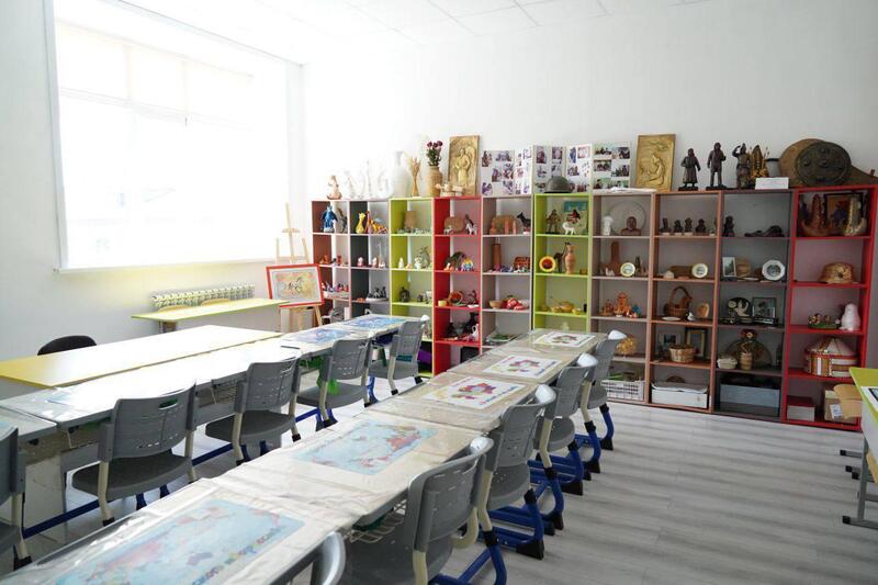 На первом этаже расположена музыкальная школа. Здесь оборудованы специализированные кабинеты для занятий сольфеджио, домброй, кобызом, фортепиано и хоровым вокалом. Также предусмотрены актовый зал, просторный холл и классная комната для групповых занятий.
