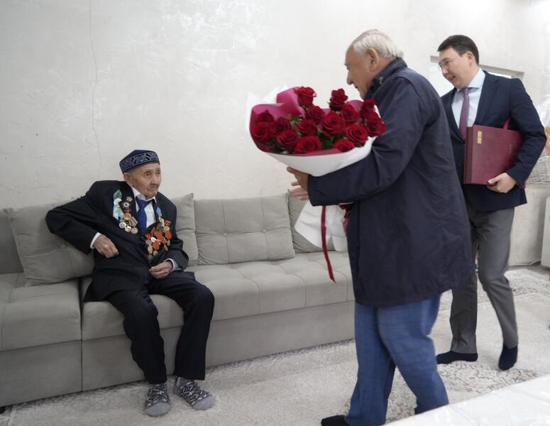 Побеседовав с ветераном и поздравив с праздником, Диас Рахметович и Ермек Абильмажинович вручили ветерану книгу «Ұрпаққа ұран болған Ұлы Жеңіс», изданную к 80-летию Великой Победы, букет цветов и праздничный продуктовый набор. В свою очередь 101-летний ветеран, поблагодарив за оказанное внимание, произнес слова благословения-бата.