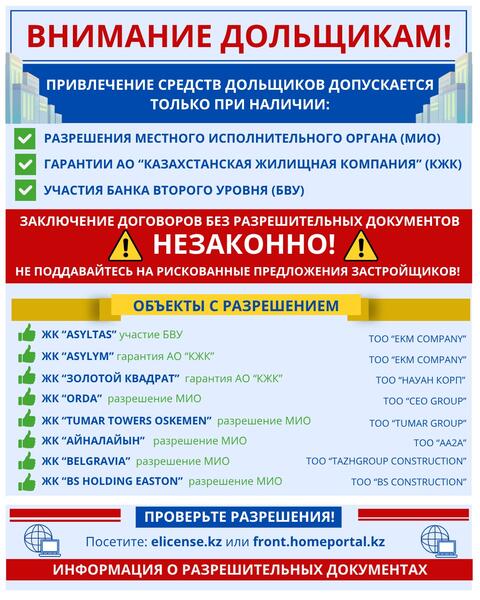 Проверяйте застройщика самостоятельно: elicense.kz — проверка по БИН, front.homeportal.kz — информация по объектам.