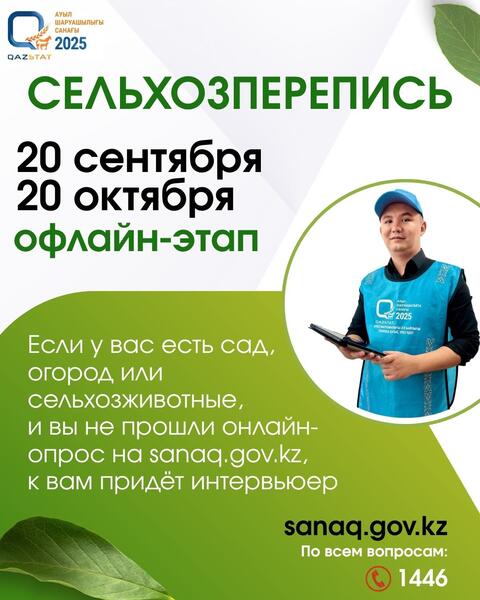 С 1 августа по 20 октября 2025 года на территории Казахстана пройдет Национальная сельскохозяйственная перепись. Это масштабное мероприятие охватывает все формы хозяйствования в аграрной сфере и проводится с целью получения актуальной информации о состоянии сельского хозяйства в стране.
