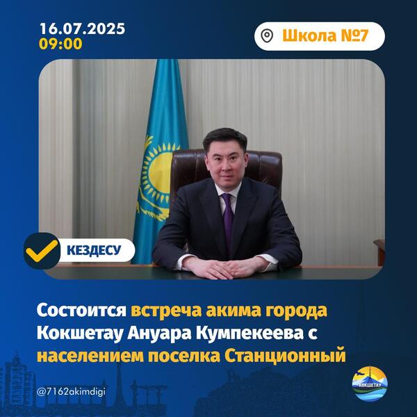 В рамках проекта акимата города Кокшетау «Открытый диалог» 16 июля 2025 года в 09:00 в здании школы №7 состоится встреча акима города Кокшетау Ануара Кумпекеева с населением посёлка Станционный.