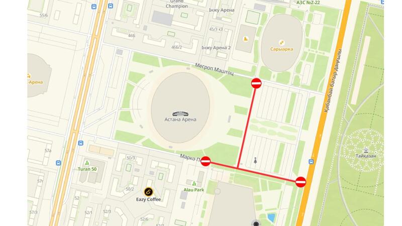 В целях обеспечения безопасности и комфорта посетителей на время проведения мероприятий 21–22 марта будет временно ограничено движение транспорта в районе стадиона «Астана Арена». Ограничения затронут улицу со стороны Ледового дворца «Алау», а также улицу вдоль восточной стороны стадиона.