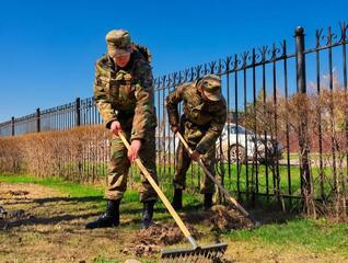 Военнослужащие воинской части 6636 вооружились граблями, мешками и лопатами и приступили к уборочным работам.