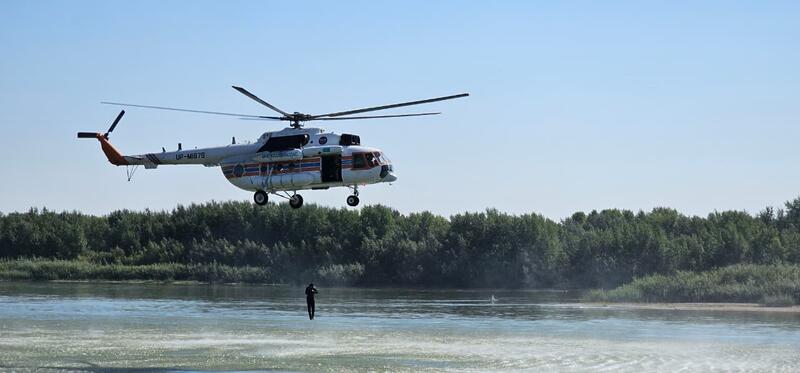 Учения проходили с участием вертолёта МИ-8 АО «Казавиаспас» и включали несколько этапов. По сценарию первой части — на акватории реки Иртыш перевернулась лодка, и в воде оказались люди. Водолазы десантировались прямо с борта воздушного судна в воду. Пострадавших оперативно обнаружили, подняли на катер и доставили на берег для оказания первой помощи.