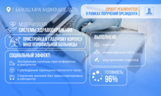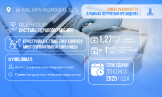 В Балхаше на базе многопрофильной больницы, где в настоящее время проводится капитальный ремонт, создаётся межрайонный медицинский хаб. На эти цели выделено более 1 млрд тенге, общая стоимость составляет 1,27 млрд тенге. В рамках проекта завершается строительство дополнительного корпуса для размещения ангиографической операционной и приёмно-диагностического отделения. Сегодня готовность объекта составляет 96%. Также завершены основные работы по возведению каркаса, прокладке инженерных сетей и внутренней отделке.