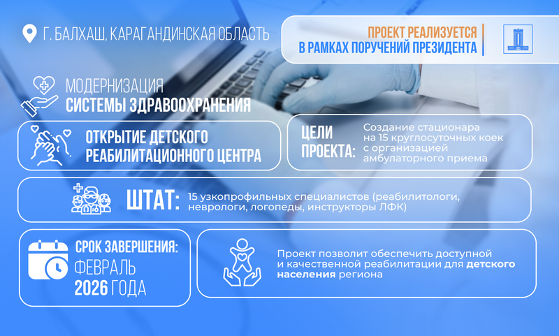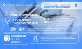 Кроме того, в Балхаше создаётся детский реабилитационный центр: для переоборудования здания бывшего санатория направлено 272,1 млн тенге. Проект предусматривает стационар и организацию амбулаторного приёма. Формируется мультидисциплинарная команда из узкопрофильных специалистов, включая реабилитологов, неврологов, логопедов и инструкторов ЛФК. Это обеспечит детям доступ к качественной реабилитации без необходимости выезда в областной центр. Завершение работ планируется в феврале 2026 года.