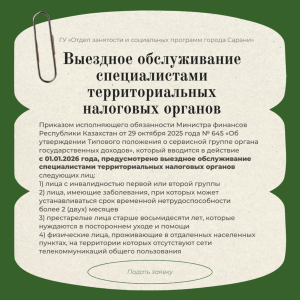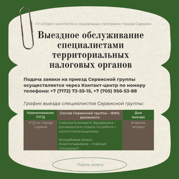 Выездное обслуживание специалистами территориальных налоговых органов: Карагандинская область, 14 Января 2026 года - новости на сайте gurk.kz
